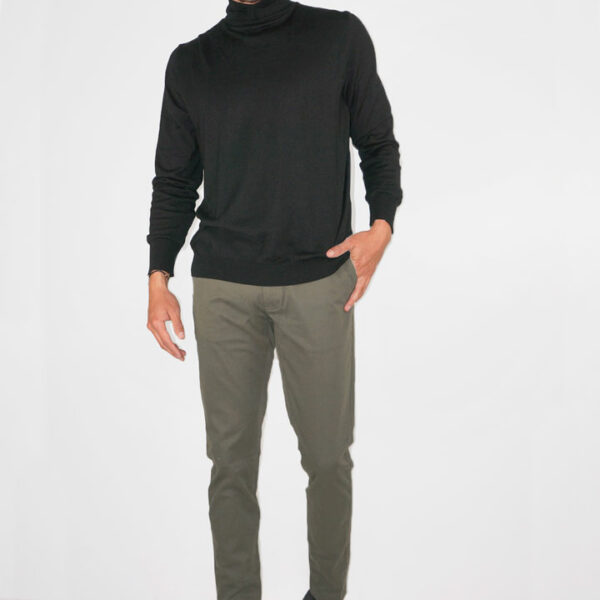 Buzo cuello tortuga negro con una mezcla de algodón y viscosa que permite que la prenda se ajuste correctamente al cuerpo