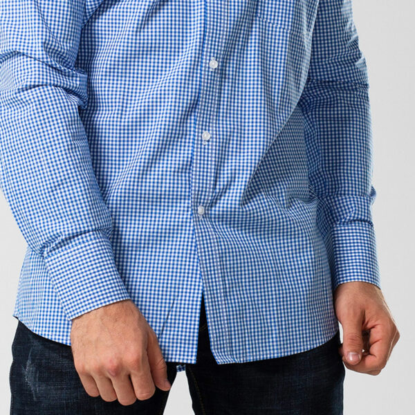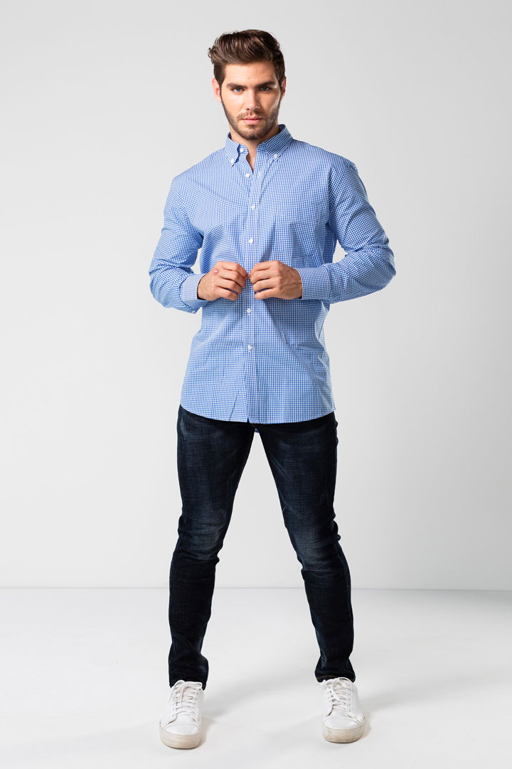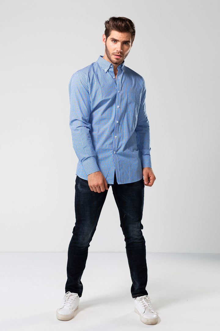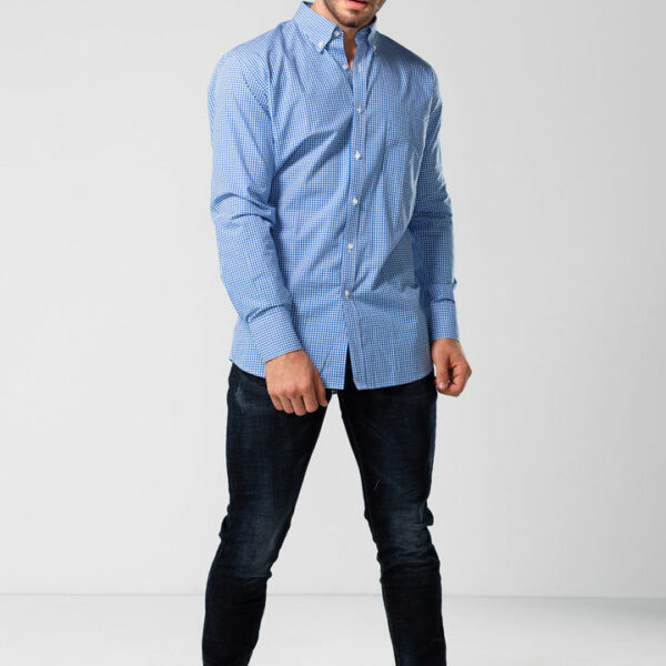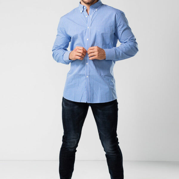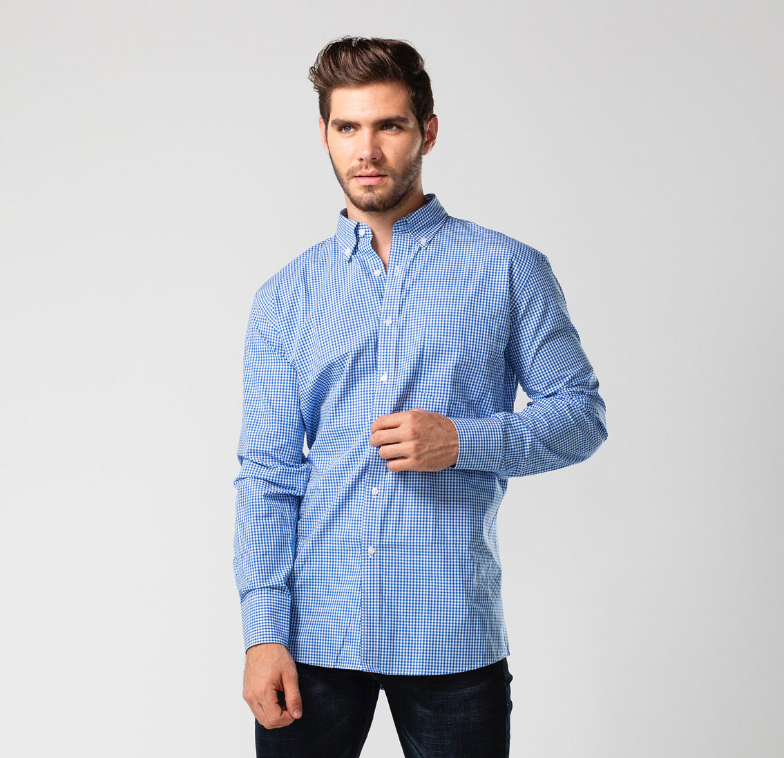 Camisa 100% algodón con bolsillo frontal cuadriculada de color celeste