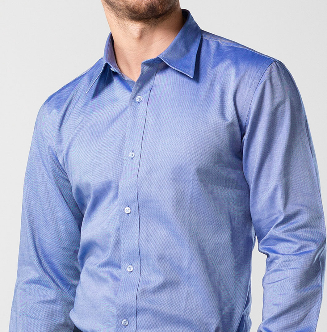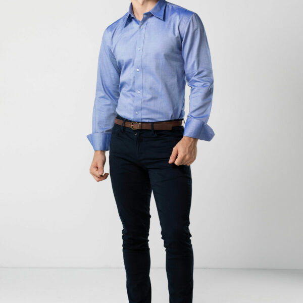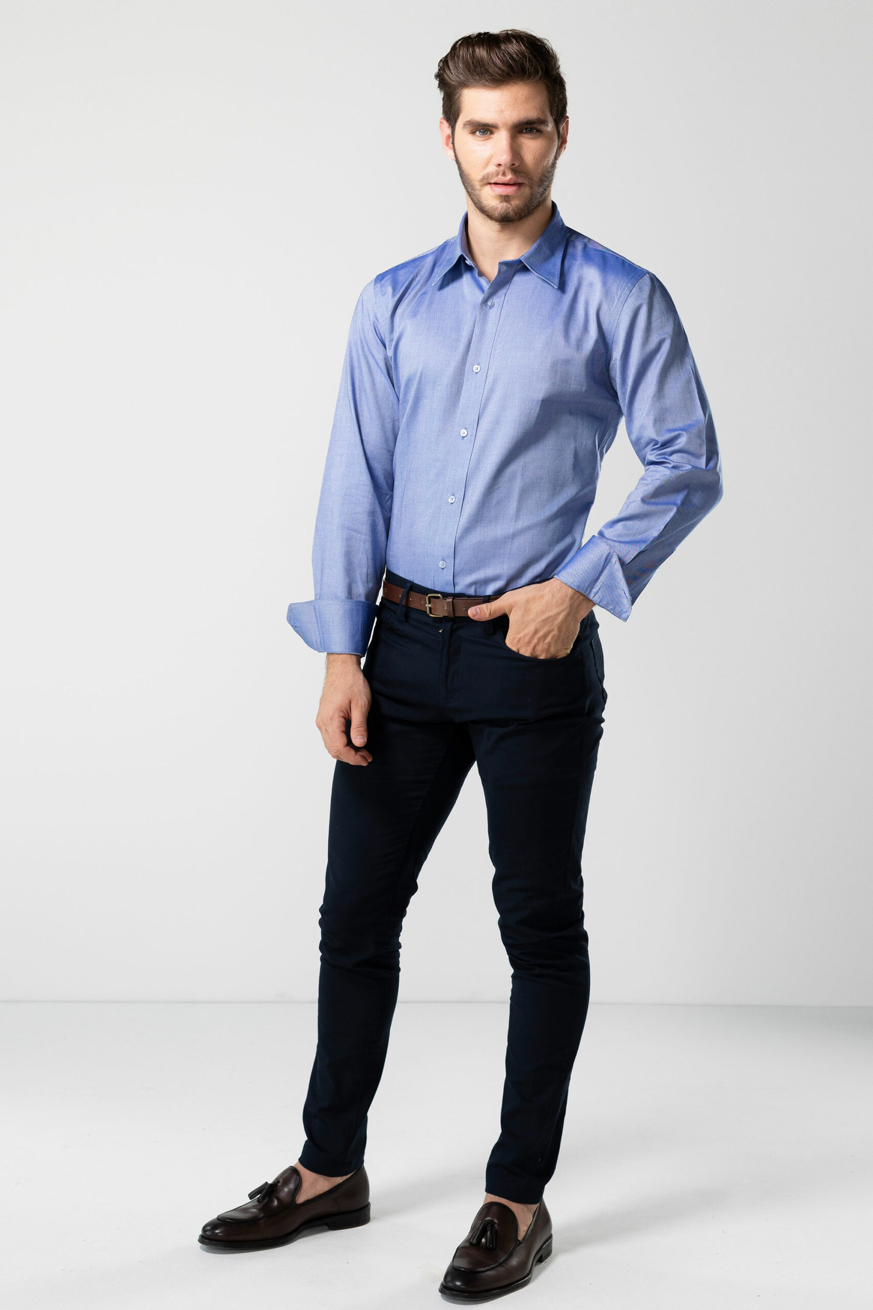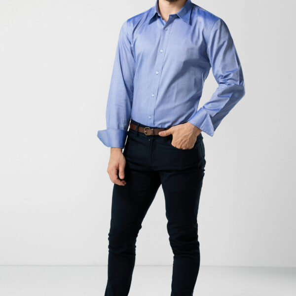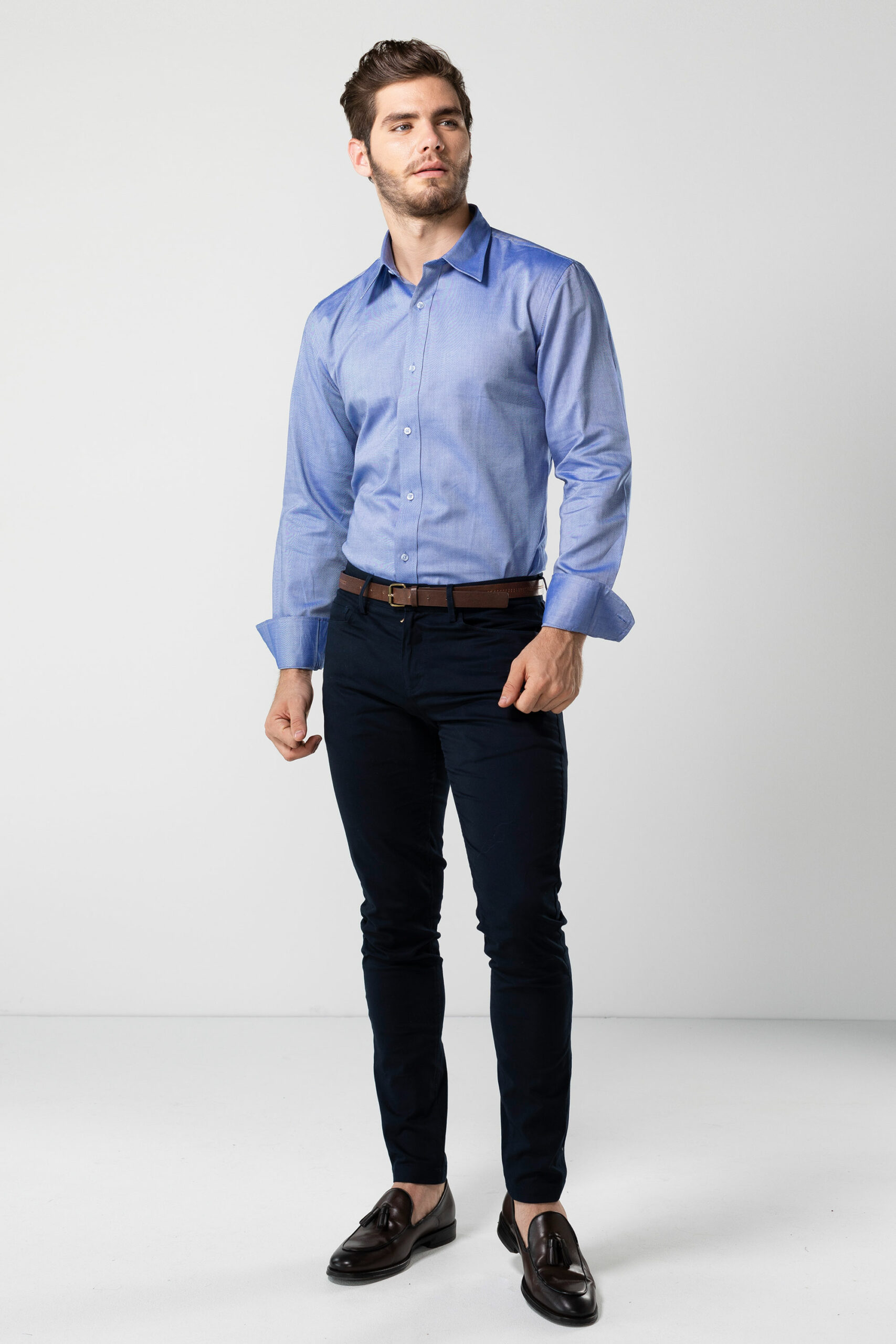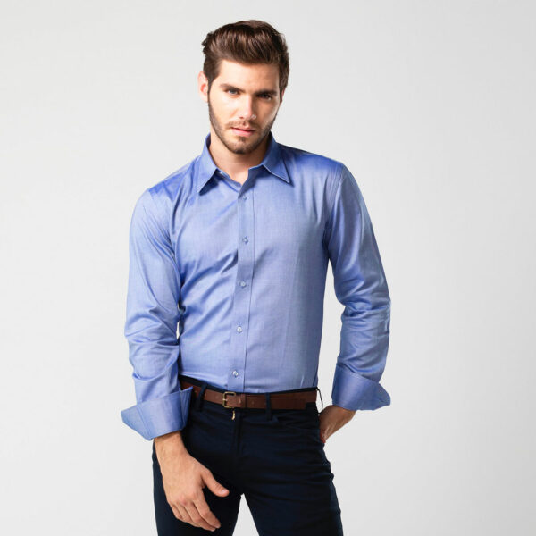 Camisa formal azul grisáceo confeccionada en algodón con cuello forward point, acabado con lavado suave que aporta elegancia y comodidad. Corte Slim Fit